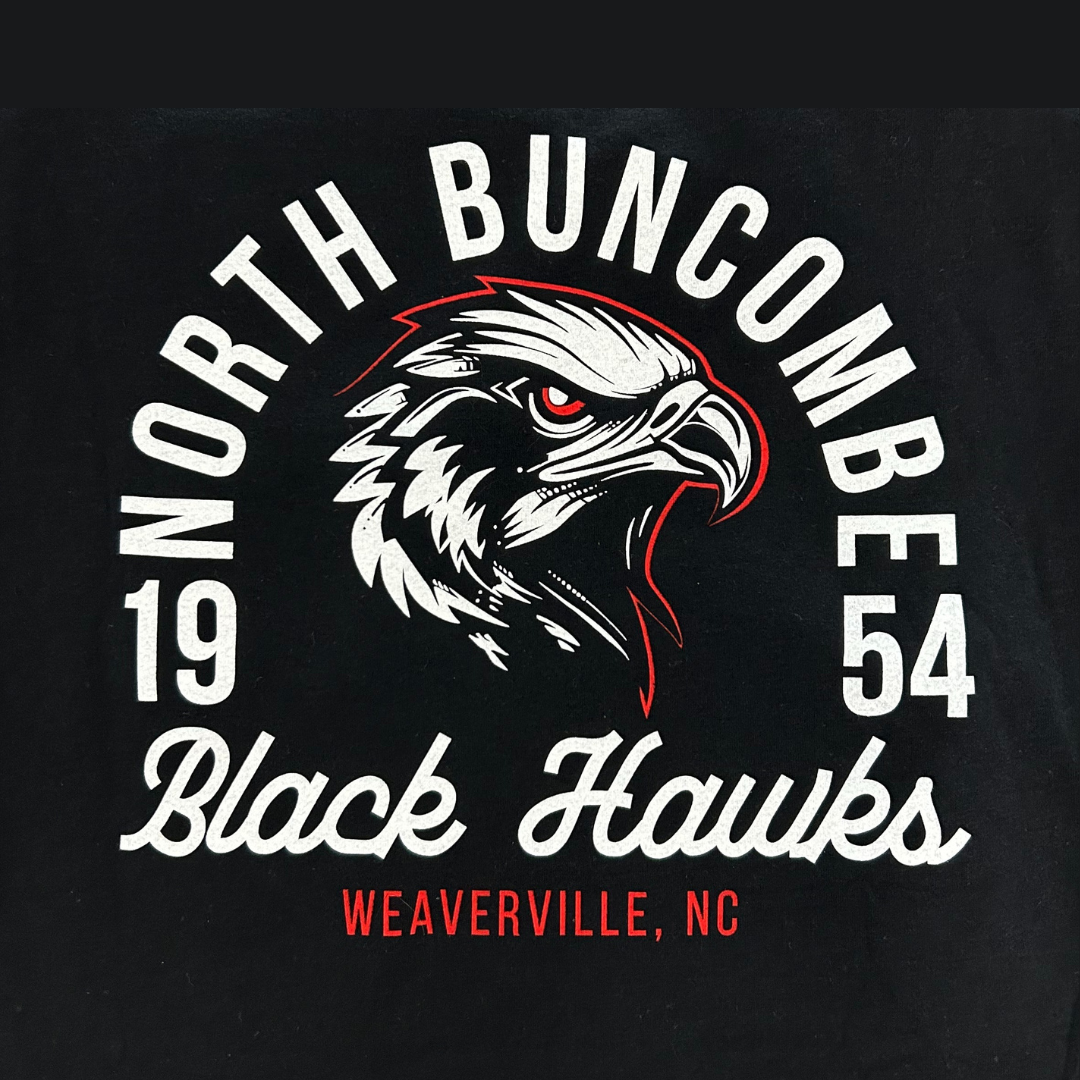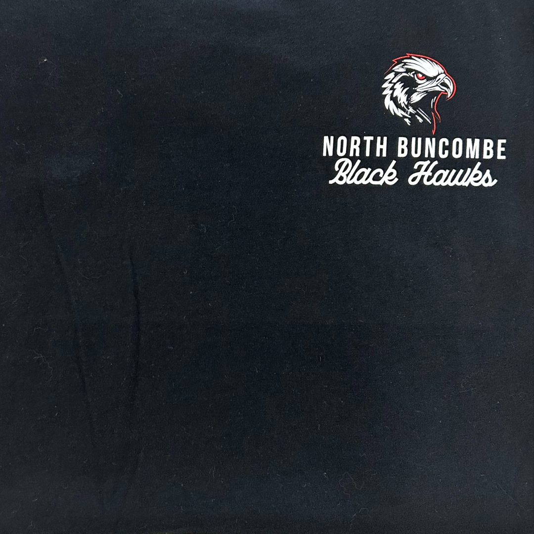 Black pocket tee with hawk head logo on the pocket and large hawk head on the back, est. 1954